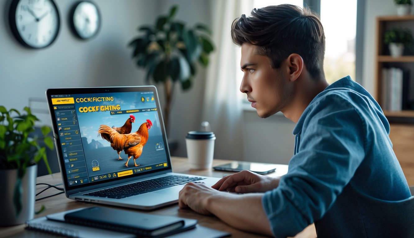 Seorang pria muda duduk di depan laptop di ruang kerja rumah, fokus melihat layar dengan permainan sabung ayam online, di meja terdapat buku catatan, ponsel, dan cangkir kopi.